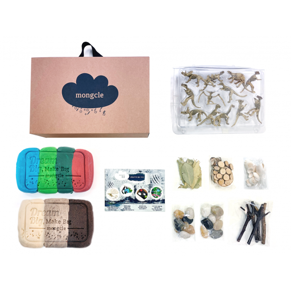 대용량 몽클과 공룡뼈피규어 장난감, 우드칩, 나뭇잎, 조개, 조약돌 자연물로 즐거운 스몰월드 만들기