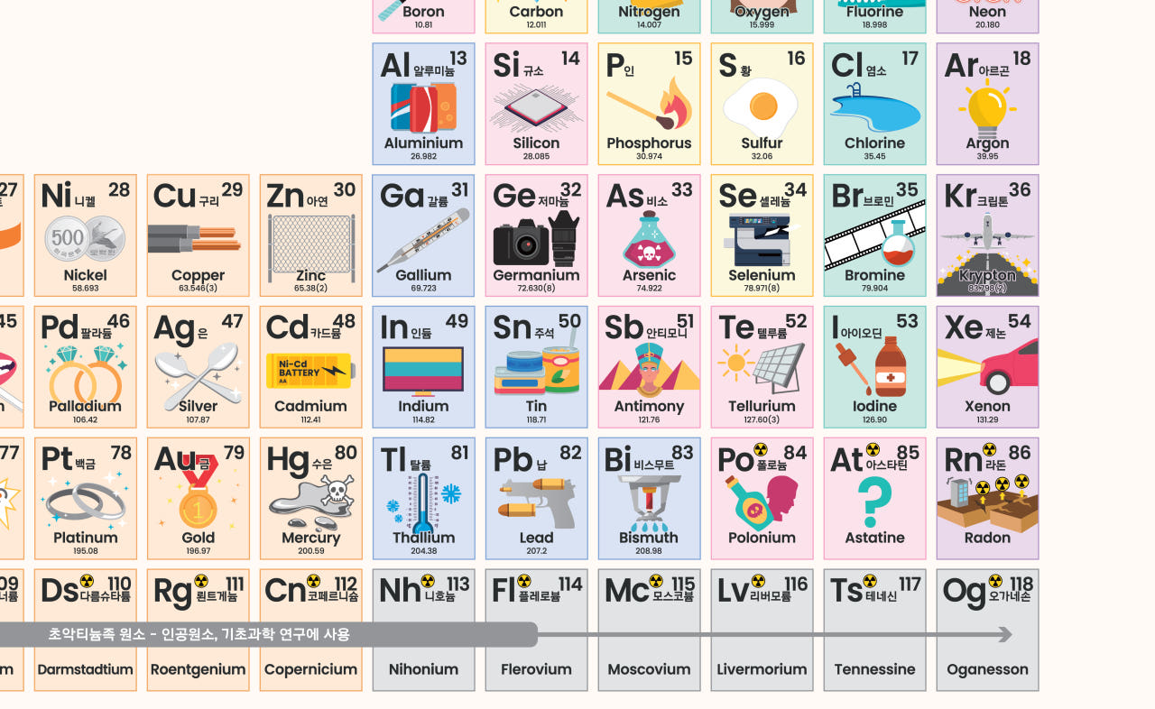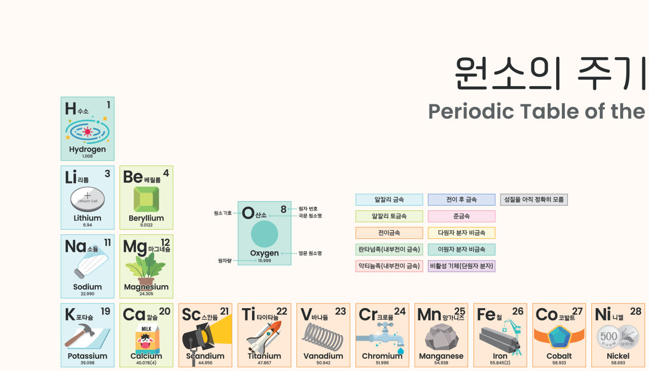 원소가 실제로 어떤 역할을 하는지 예시 그림을 넣어 디자인한 주기율표 포스터