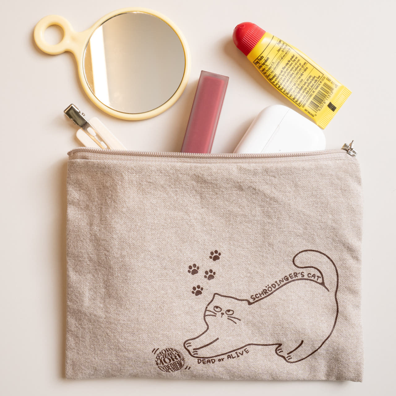 모어사이언스 슈뢰딩거 고양이 미니 사각 지퍼 파우치 베이지 여자 여행용 화장품 생리대
