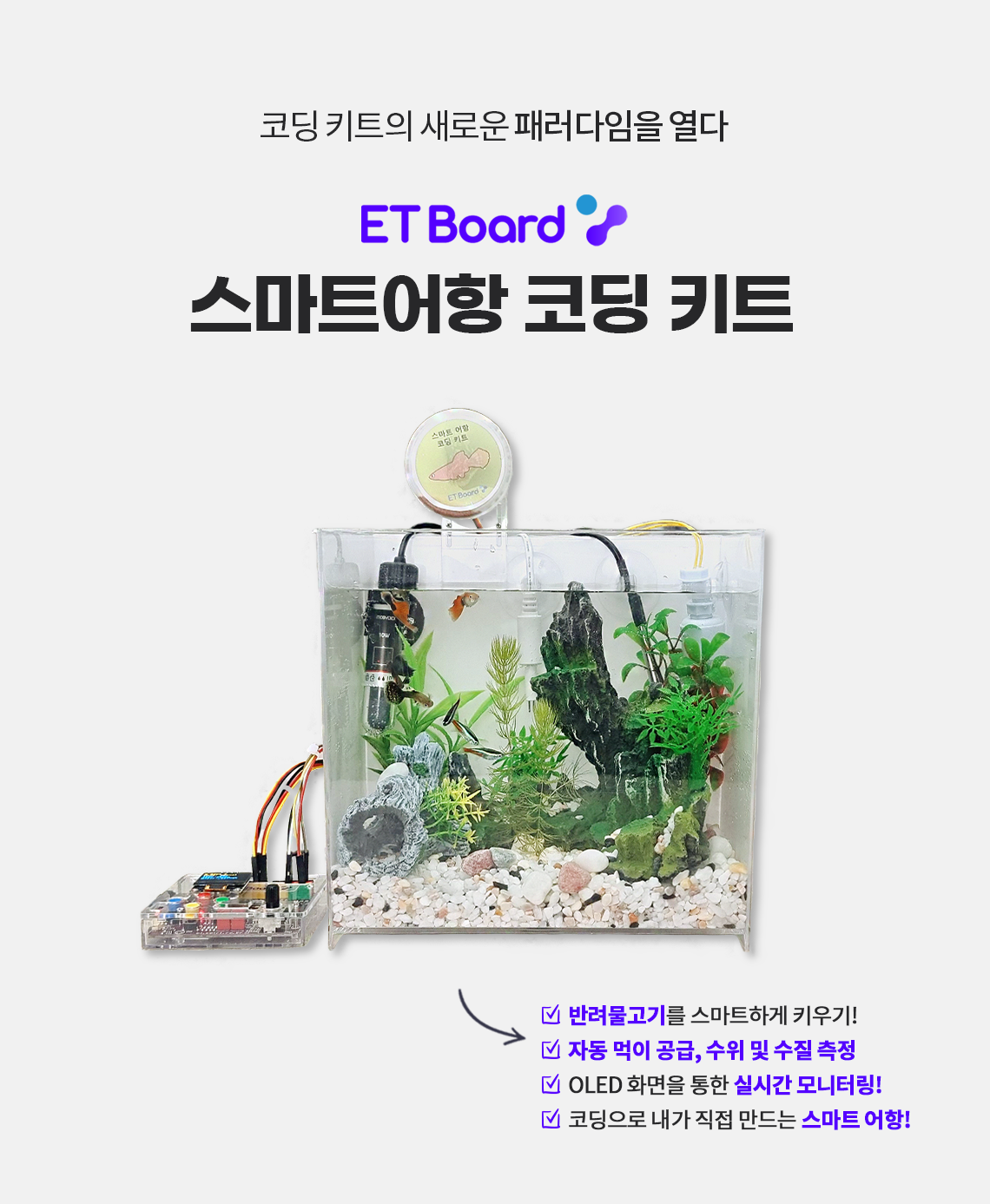 이티보드와 여러 환경센서들을 이용해 수온, 수질, 수위를 측정하고, 자동으로 먹이를 공급할 수 있습니다. 어항의 상태를 실시간으로 모니터링 가능한 스마트 어항의 원리를 익힐 수 있는 코딩 키트