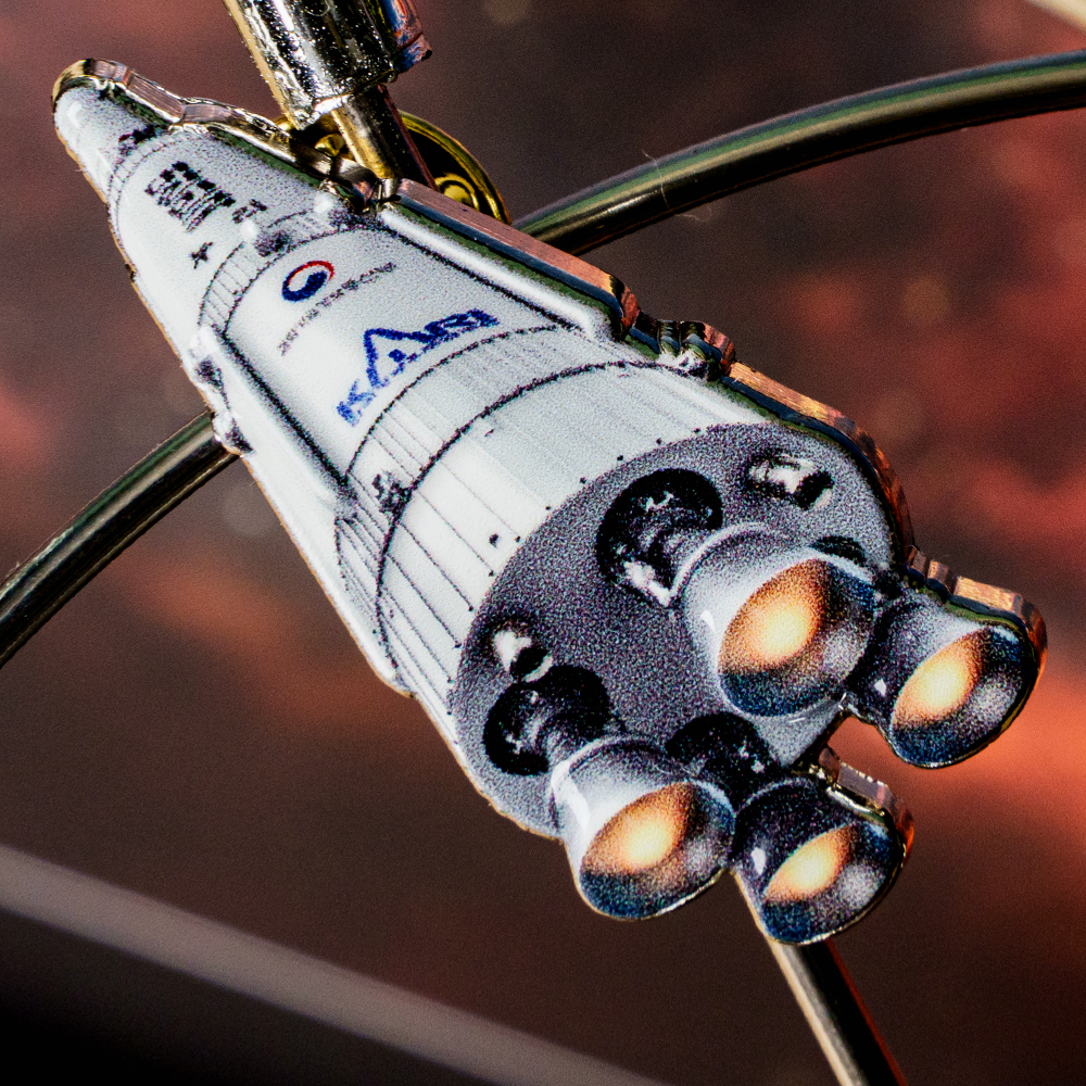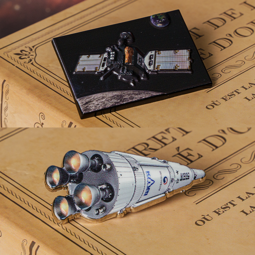 한국형발사체 누리호와 달 궤도 탐사선 다누리호를 모티브로 제작한 금속 배지