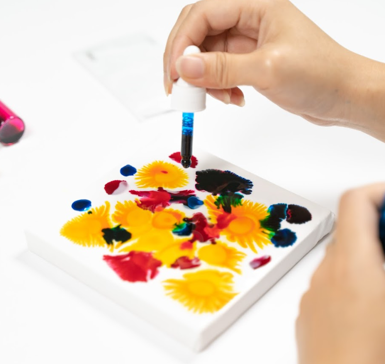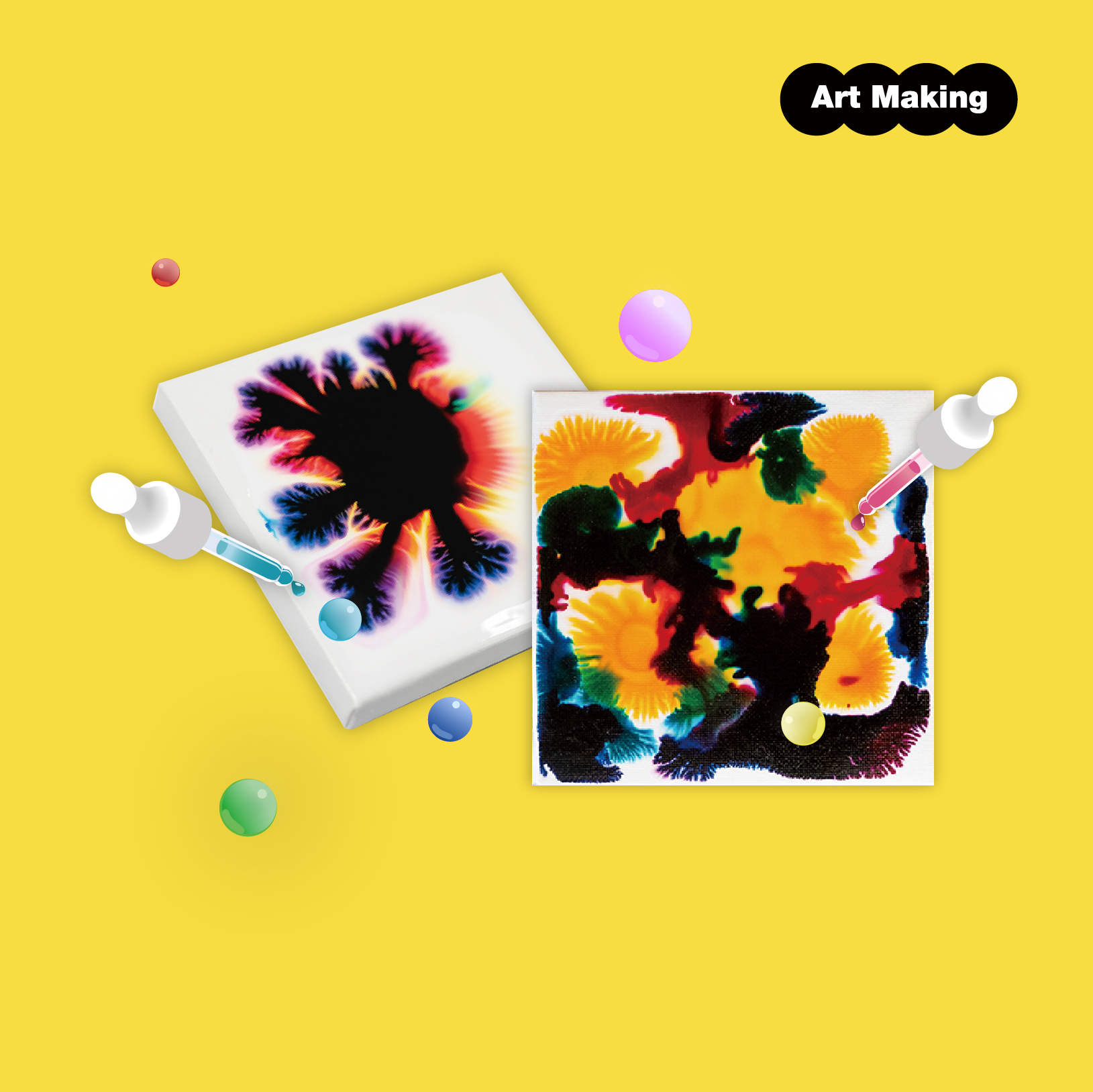 <잉크 페인팅 키트 - 피고 지는 색>을 활용하여 삼원색인 빨강, 노랑, 파랑의 무한한 가능성을 확인해보세요.