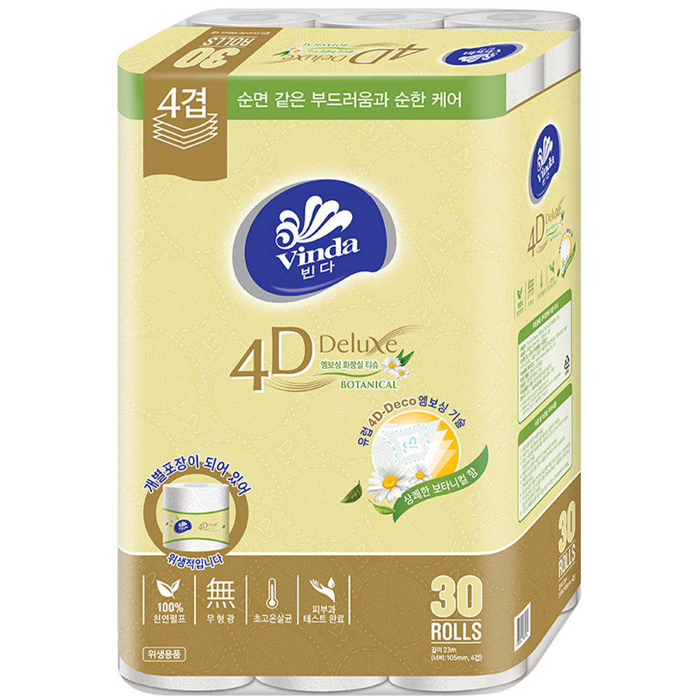 ■피부 저자극 테스트 완료. 유럽4D■ 빈다 4D Deluxe 4겹 보타니컬 엠보싱 롤 화장지 23m 60롤 (무형광 100%펄프 vinda)