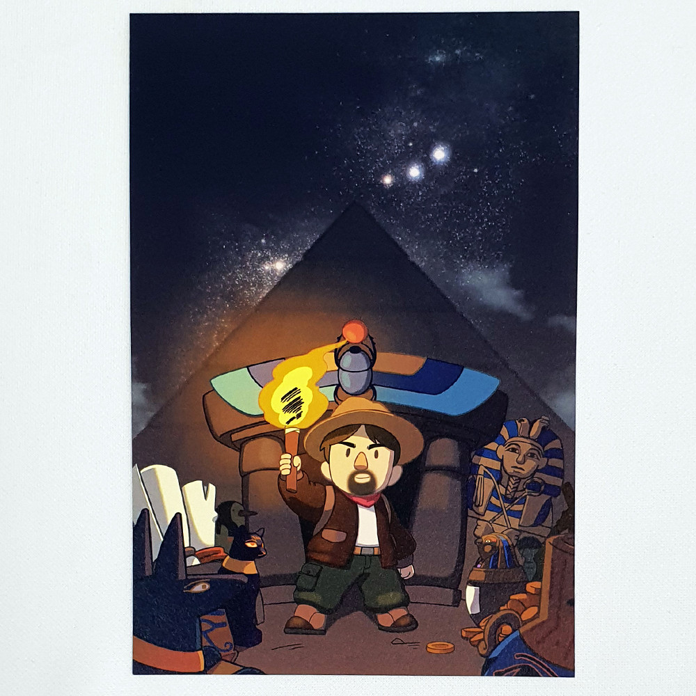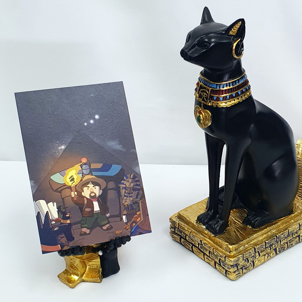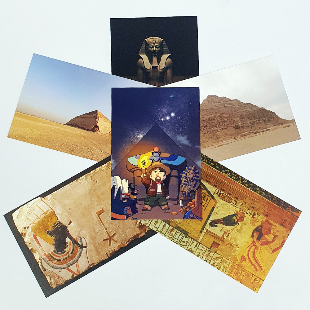 피라미드를 탐험하는 캐릭터가 담긴 엽서